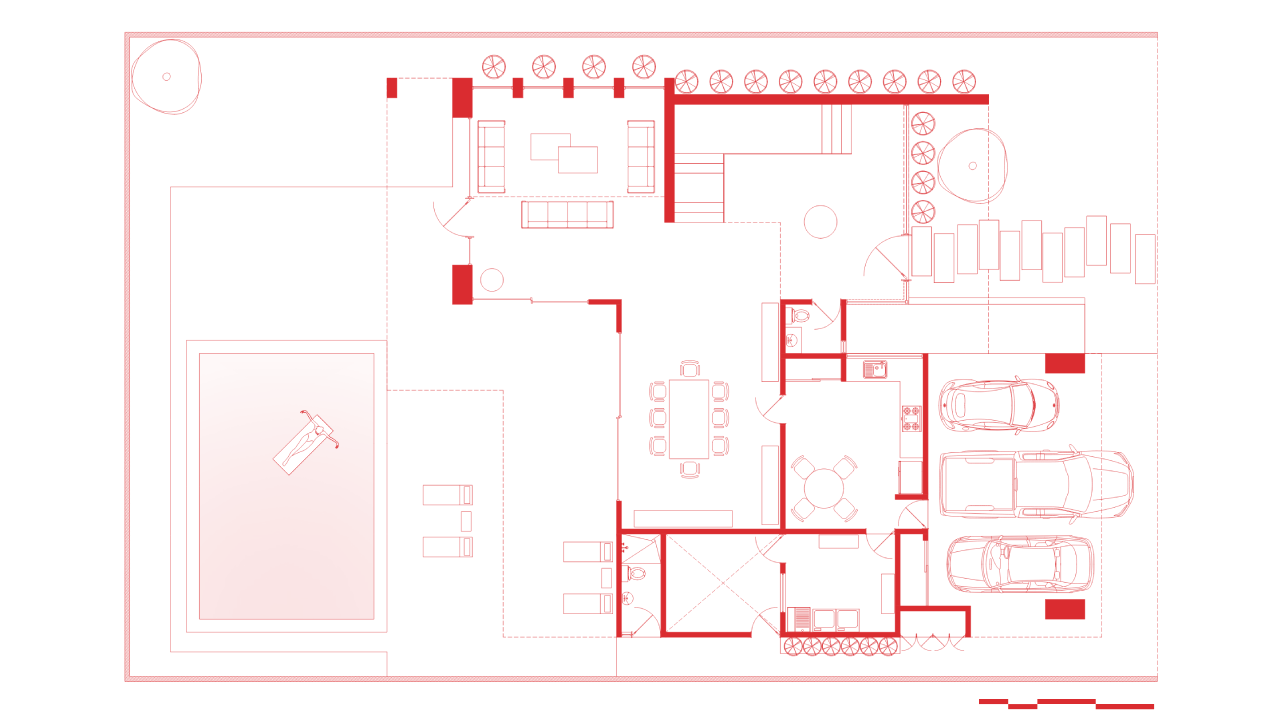 La planta baja de la casa moderna Nogal está diseñada bajo un esquema funcional que prioriza la integración social y la conexión con el exterior. Desde el acceso principal, se desarrolla un vestíbulo a doble altura que organiza la circulación vertical y define el eje central del proyecto. La planta baja se organiza bajo un concepto abierto que integra sala, comedor y cocina en un mismo eje visual. Esta disposición no solo favorece la convivencia familiar, sino que también permite una transición fluida hacia la terraza y la alberca. De esta manera, el interior se prolonga hacia el exterior, generando una experiencia espacial continua.