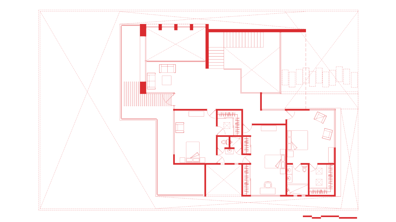 La planta alta de la casa moderna Nogal está organizada a partir del vacío central generado por la doble altura, lo que permite iluminación natural constante y una conexión visual entre niveles, sin perder la privacidad mediante la distribución estratégica de recámaras desde la doble altura en el acceso. La recámara principal destaca por sus dimensiones amplias, vestidor y baño privado al frente de la casa, mientras que las habitaciones secundarias mantienen iluminación y ventilación natural óptima.