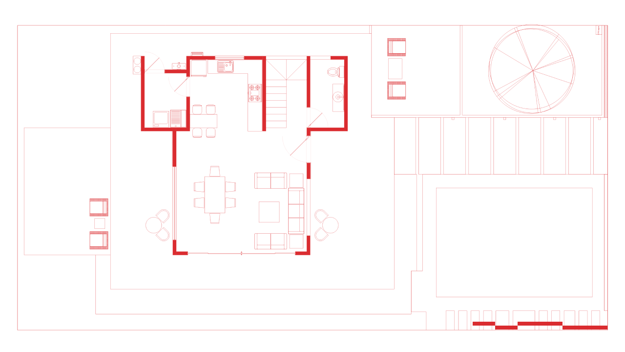 Planta Baja (Social): Un espacio de planta libre donde la sala, el comedor y la cocina convergen sin muros divisorios. Grandes ventanales abren el interior hacia la terraza y el jardín, duplicando la sensación de amplitud y conectando a los usuarios con la naturaleza.
