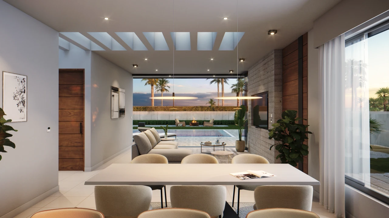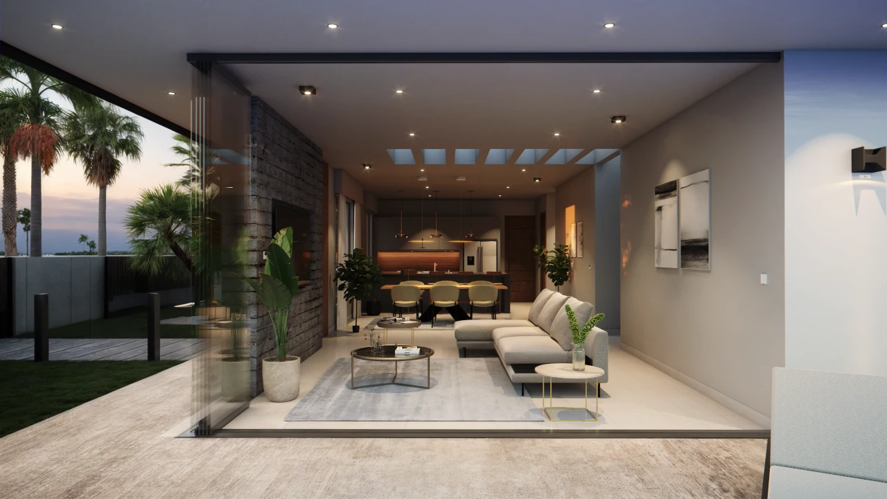 El acceso conduce a un espacio de planta libre que integra sala, comedor y cocina, el cual se extiende hacia la terraza exterior que alberga a la alberca. Todo esto se logra mediante cerramientos acristalados corredizos que se ocultan en los muros, desdibujando el límite entre interior y exterior.