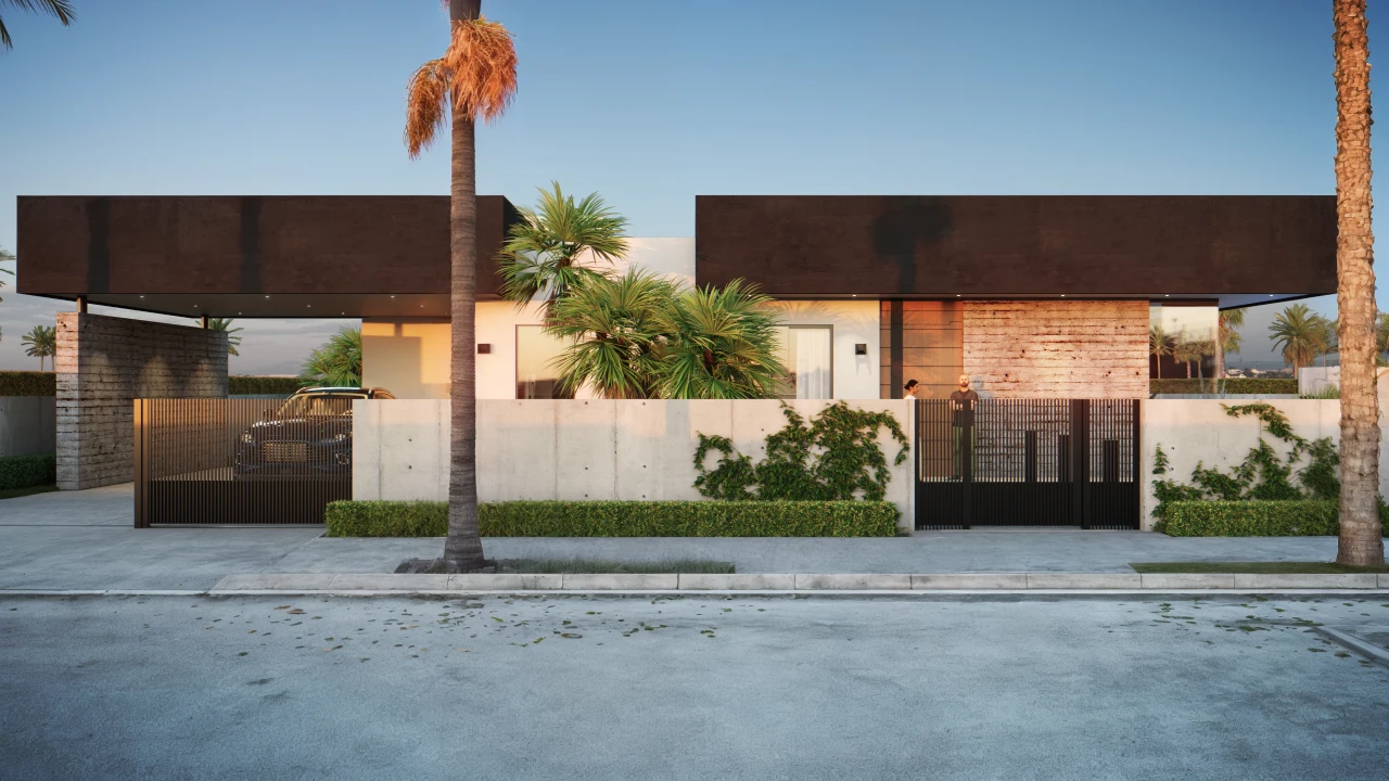 El diseño de la Casa Residencial Welhouse se fundamenta en la intersección de volúmenes puros. La fachada principal se cierra hacia la calle mediante un muro ciego de concreto aparente y un volumen superior en acabado oscuro que funciona como elemento jerarquizador de la cubierta. Esta decisión proyectual, característica de nuestro despacho de arquitectos, busca mitigar la incidencia solar directa y otorgar privacidad visual respecto a la vía pública, reservando la apertura total hacia la fachada posterior.