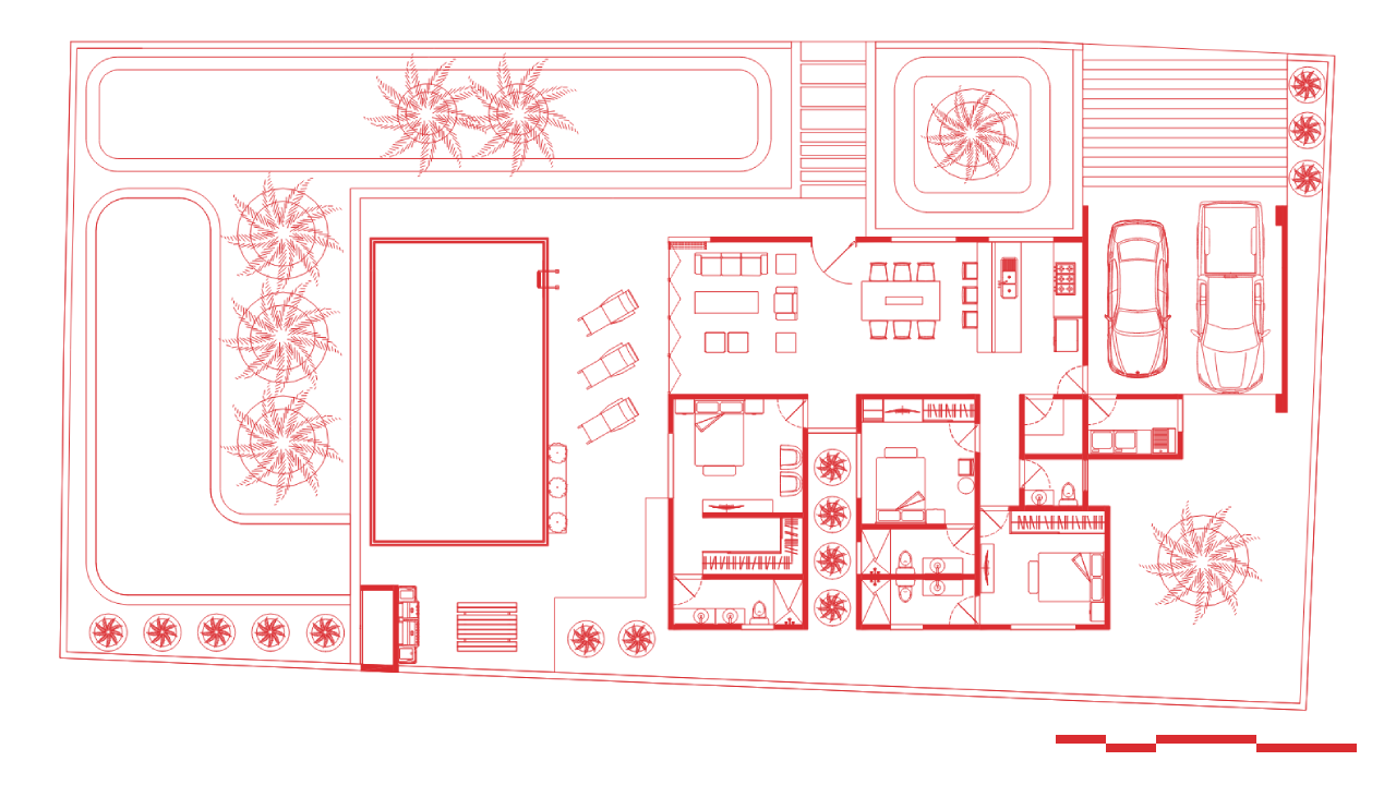 La estructura incorpora pérgolas de concreto con lucernarios cenitales que bañan de luz natural el área de circulación y la cocina, reduciendo la necesidad de iluminación artificial. La materialidad combina la textura rugosa del concreto encofrado con la calidez de la carpintería en madera tropical, equilibrando la estética industrial con el contexto caribeño. La piscina actúa como elemento focal del patio posterior, alineada con los ejes visuales principales trazados desde el interior de la vivienda.